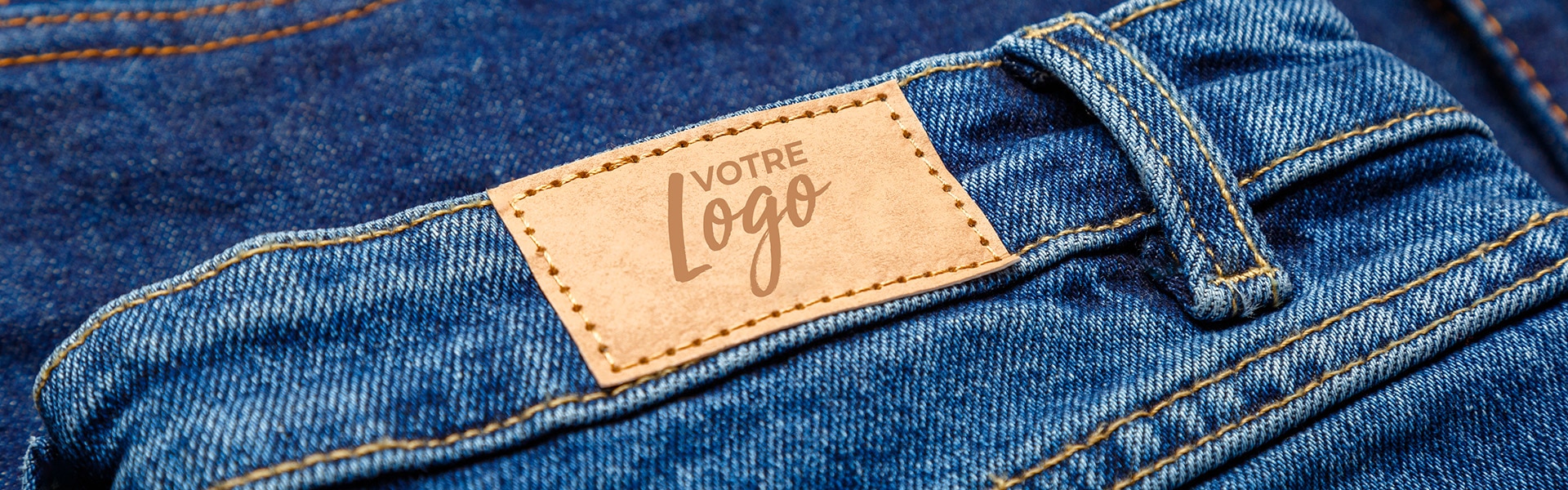 Personnalisation sur vêtements à l'aide d'étiquettes tissées ou d'écussons personnalisés. Idéale pour une pose à la nuque ou comme étiquette de marque, ou pour une pose repliée sur le rebord d'un vêtement.